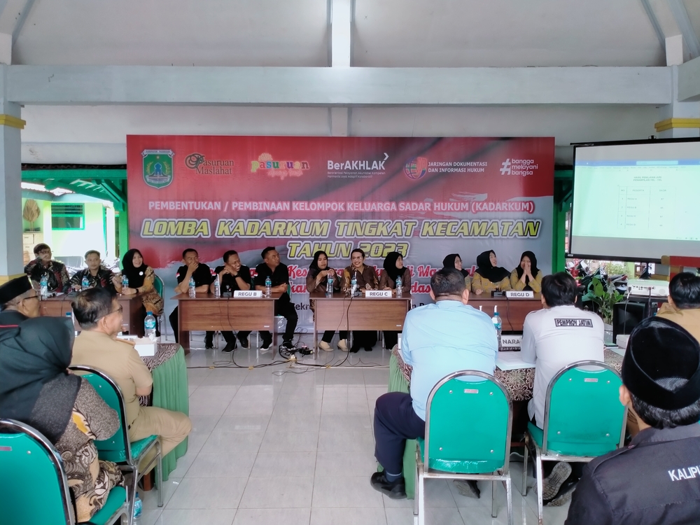 Kabupaten Pasuruan – Bagian Hukum Sekretariat Daerah Kabupaten Pasuruan melaksanakan Lomba Keluarga Sadar Hukum (Kadarkum) Tingkat Kecamatan Tahun 2023 sebagai upaya untuk meningkatkan kesadaran hukum di masyarakat demi mewujudkan masyarakat cerdas hukum. Kegiatan ini dilaksanakan pada hari Selasa, 25 Juli 2023 yang bertempat di Pendopo Kantor Kecamatan Tutur Kabupaten Pasuruan. Dengan diikuti peserta dari 4 (empat) Desa di Kecamatan Tutur yang terdiri dari :